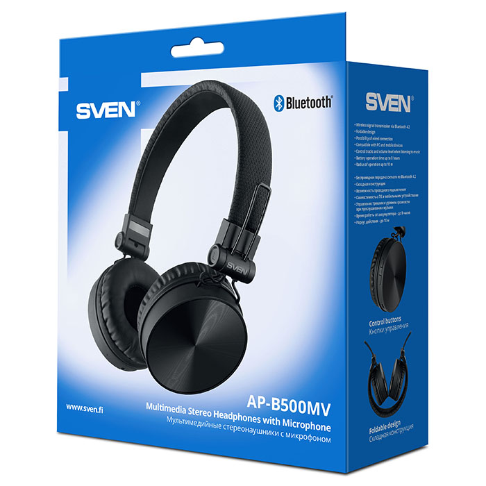Home I Shop I Wireless stereo headphones with microphone SVEN AP-B500MV, black, Bluetooth, call acceptance, track switching control possibility, detachable cable